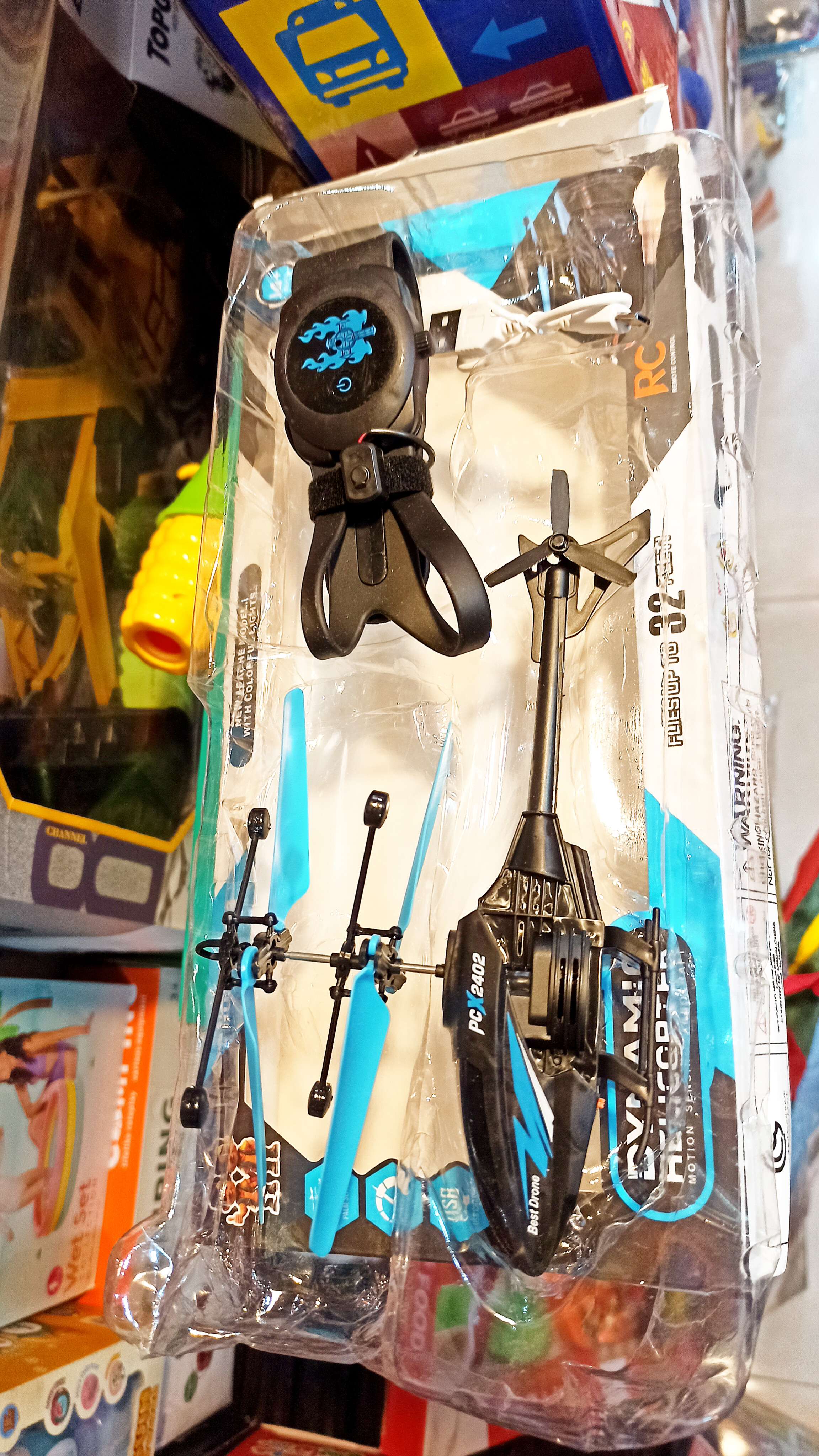 این هلیکوپتر دارای کنترل ساعتی هستش که به دور مچ دست بسته شده و با فشار دکمه روی ساعت هلیکوپتر روشن شده و مجدد با فشار دکمه هلکوپتر خاموش شده
