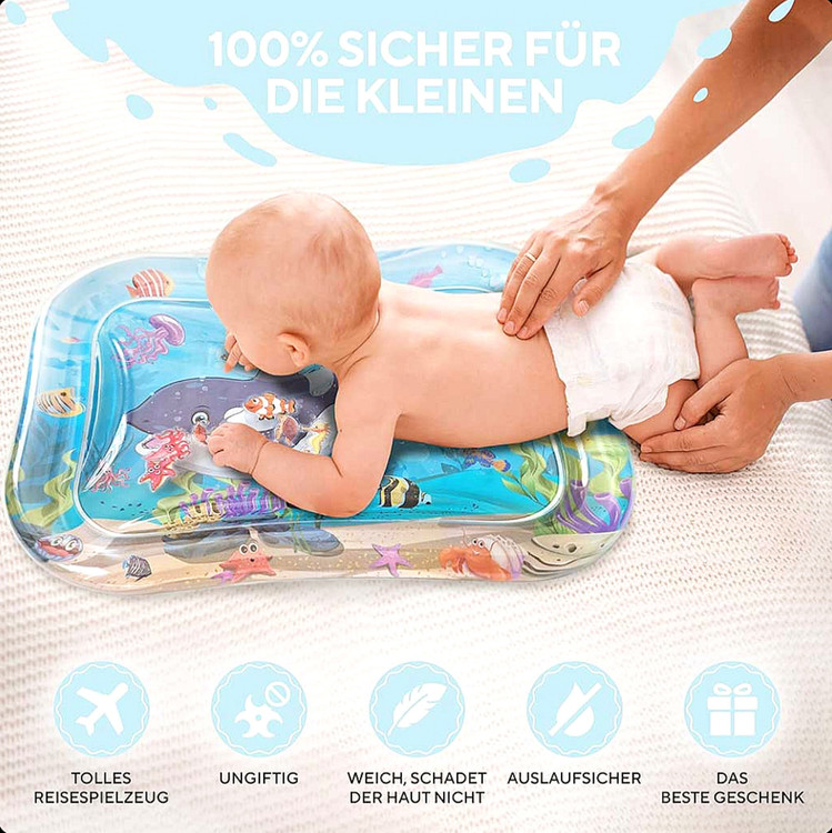 واتر مت مستطیل کودک یه تشک بازی آبیه که داخلش با آب پر میشه و چند تا عروسک و طرح حیوانات رنگی داره که وقتی بچه با دست یا پاهاش روی سطح میزنه، اون شکلها شروع به حرکت میکنن.این تشک آبی مخصوص کوچولوهای سه تا هجده ماههست و بیشتر برای وقتی استفاده میشه که بچه رو روی شکمش میذارن، یعنی موقع «تامی تایم». توی این زمان، بچه با بالا گرفتن سرش و حرکت دادن دست و پاش، عضلههای گردن، شونه و پشتش قویتر میشن.