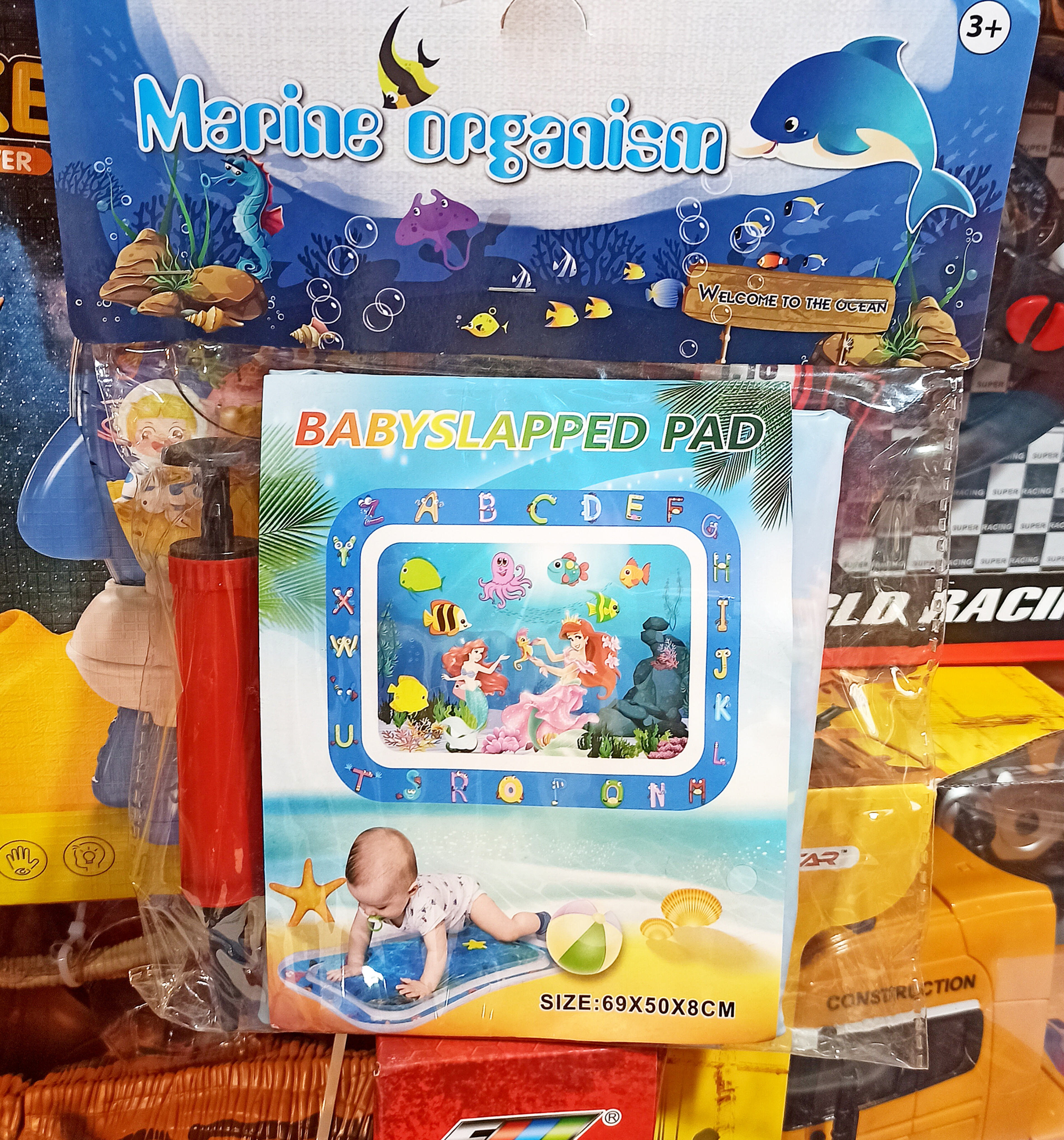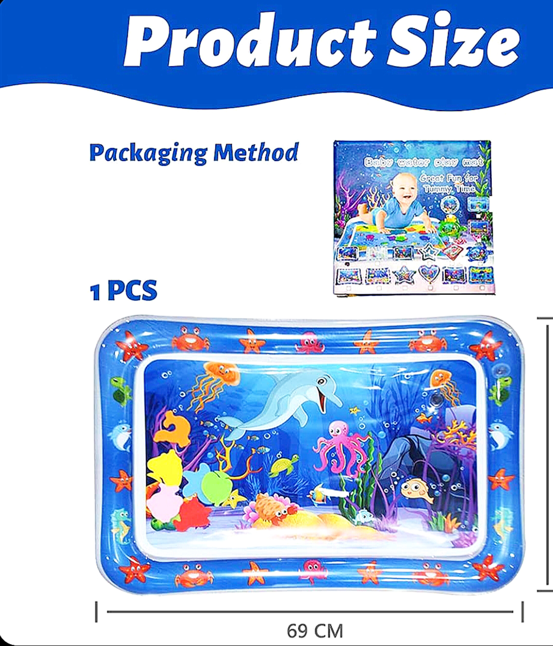 واتر مت مستطیل کودک یه تشک بازی آبیه که داخلش با آب پر میشه و چند تا عروسک و طرح حیوانات رنگی داره که وقتی بچه با دست یا پاهاش روی سطح میزنه، اون شکلها شروع به حرکت میکنن.این تشک آبی مخصوص کوچولوهای سه تا هجده ماههست و بیشتر برای وقتی استفاده میشه که بچه رو روی شکمش میذارن، یعنی موقع «تامی تایم». توی این زمان، بچه با بالا گرفتن سرش و حرکت دادن دست و پاش، عضلههای گردن، شونه و پشتش قویتر میشن.